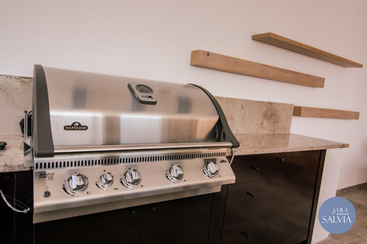 Prostor, který bude oblíbeným místem pro každého, vybavený grilem, kuchyňskými spotřebiči a vitrínou na víno s masivním dřevěným stolem pro 12 osob pro gastronomické potěšení.
